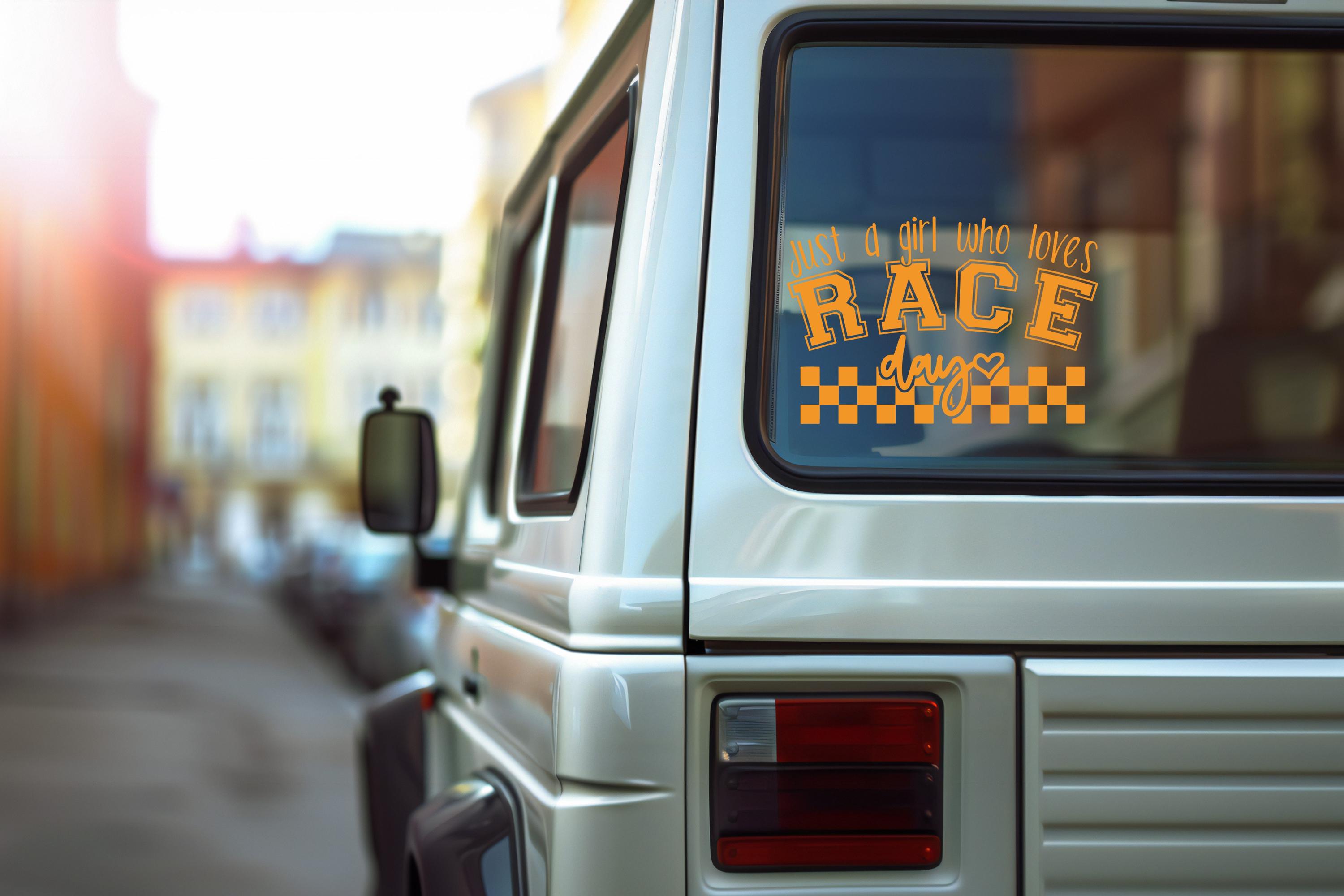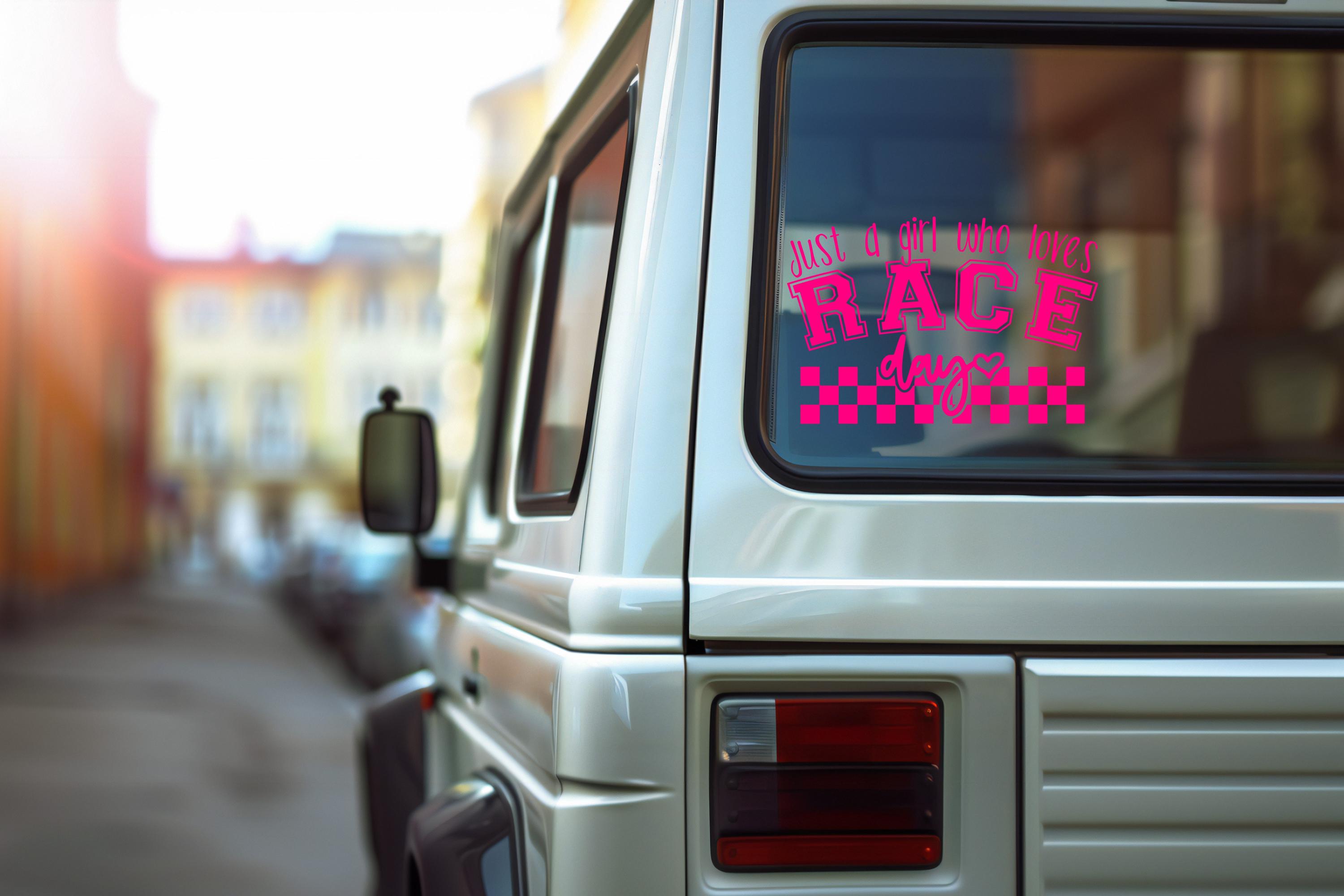 Ignite your passion for car racing with our "Just a Girl Who Loves Race Day" vinyl decal. This racing vinyl decal is a captivating symphony of design, featuring the iconic checkered flag motif that effortlessly captures the thrill of the race. Whether it's adorned on your car, laptop, or any smooth surface, this car sticker transforms everyday items into expressions of your love for the speedway. With its easy application, you'll enjoy the seamless experience of adding this sticker to your collection. Crafted for durability, each car decal is designed to withstand the demands of the road and the spirit of your next race day. Let your personality shine as bright as the finish line with this versatile vinyl check. Perfect for those who live life in the fast lane, and wish to display their racing spirit proudly.