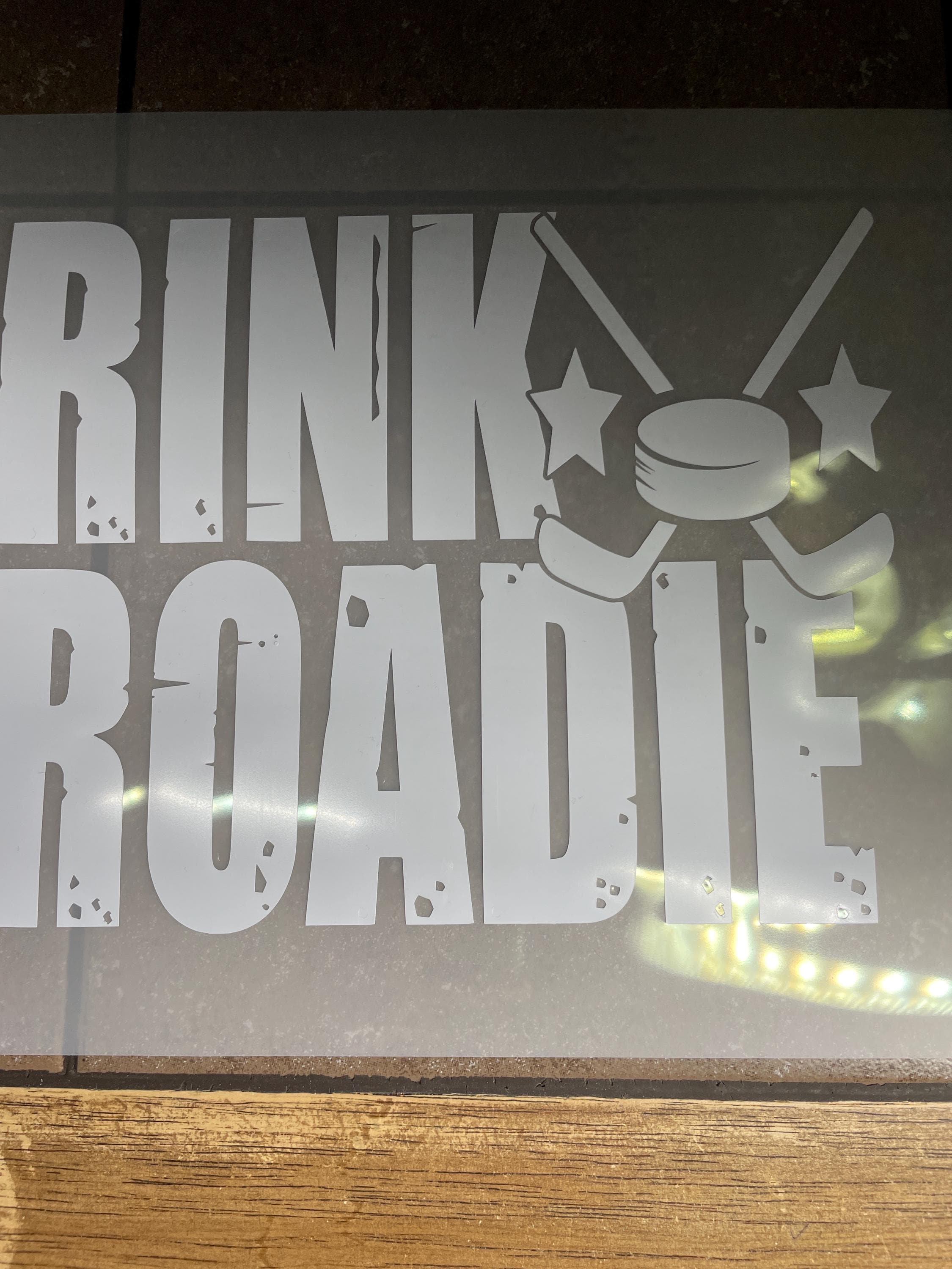 Vinyl decal reading ‘RINK ROADIE’ in distressed black text, with the letter ‘K’ stylized using a hockey puck and crossed sticks, flanked by stars.