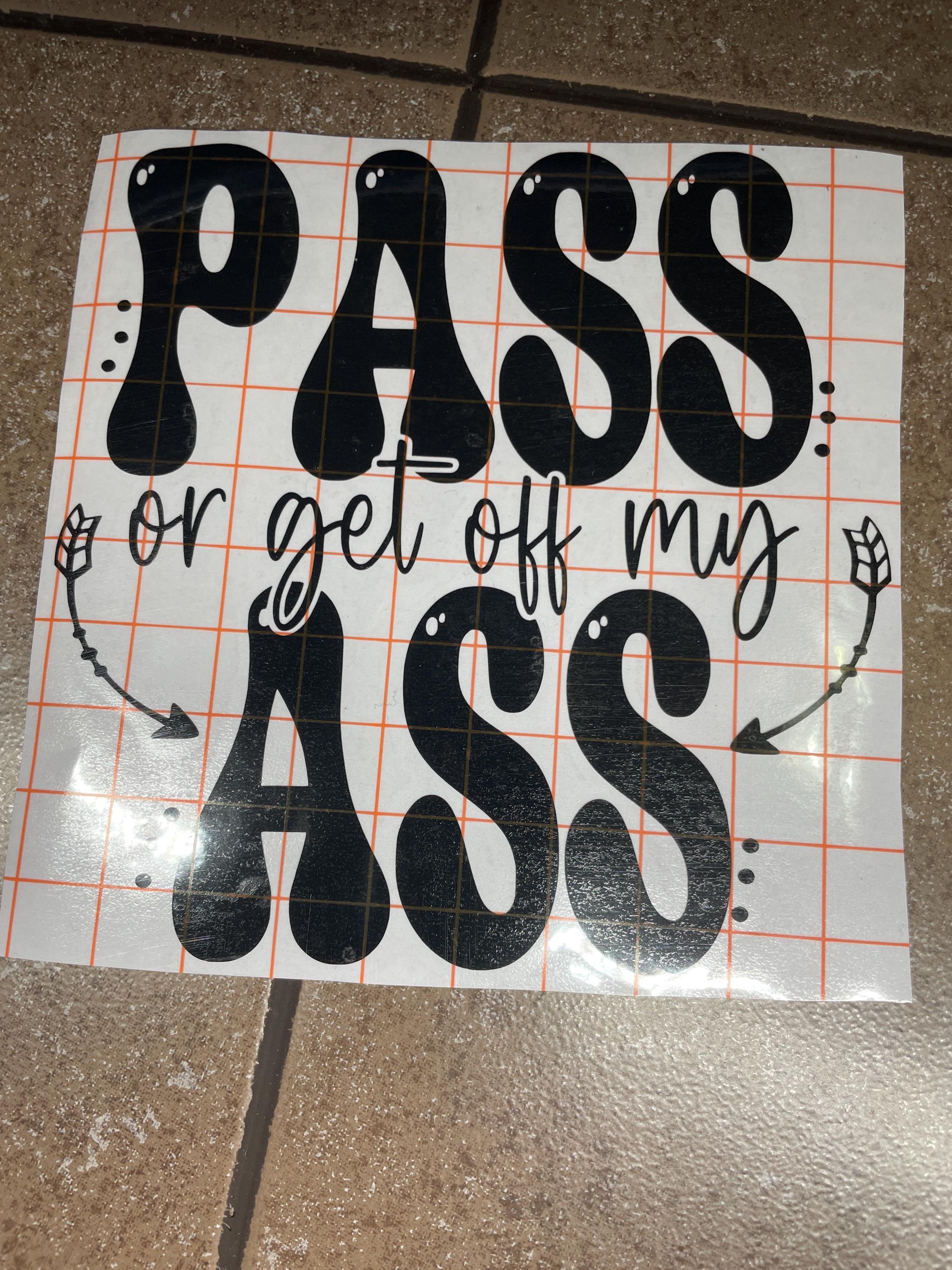 Featuring the cheeky phrase “PASS or get off my ASS” in eye-catching typography, this sticker is perfect for drivers who like to keep it real. Whether you're tired of tailgaters or just love a good laugh, this decal adds personality to your ride.