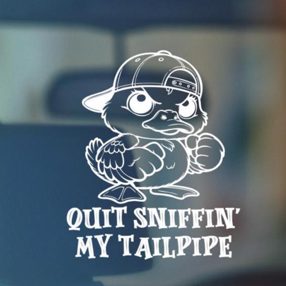 This bold vinyl car decal features an angry cartoon duck crossing its arms with the hilarious phrase: “Quit Sniffin My Tailpipe.” Perfect for drivers who want to add humor, personality, and a touch of sass to their vehicle.
