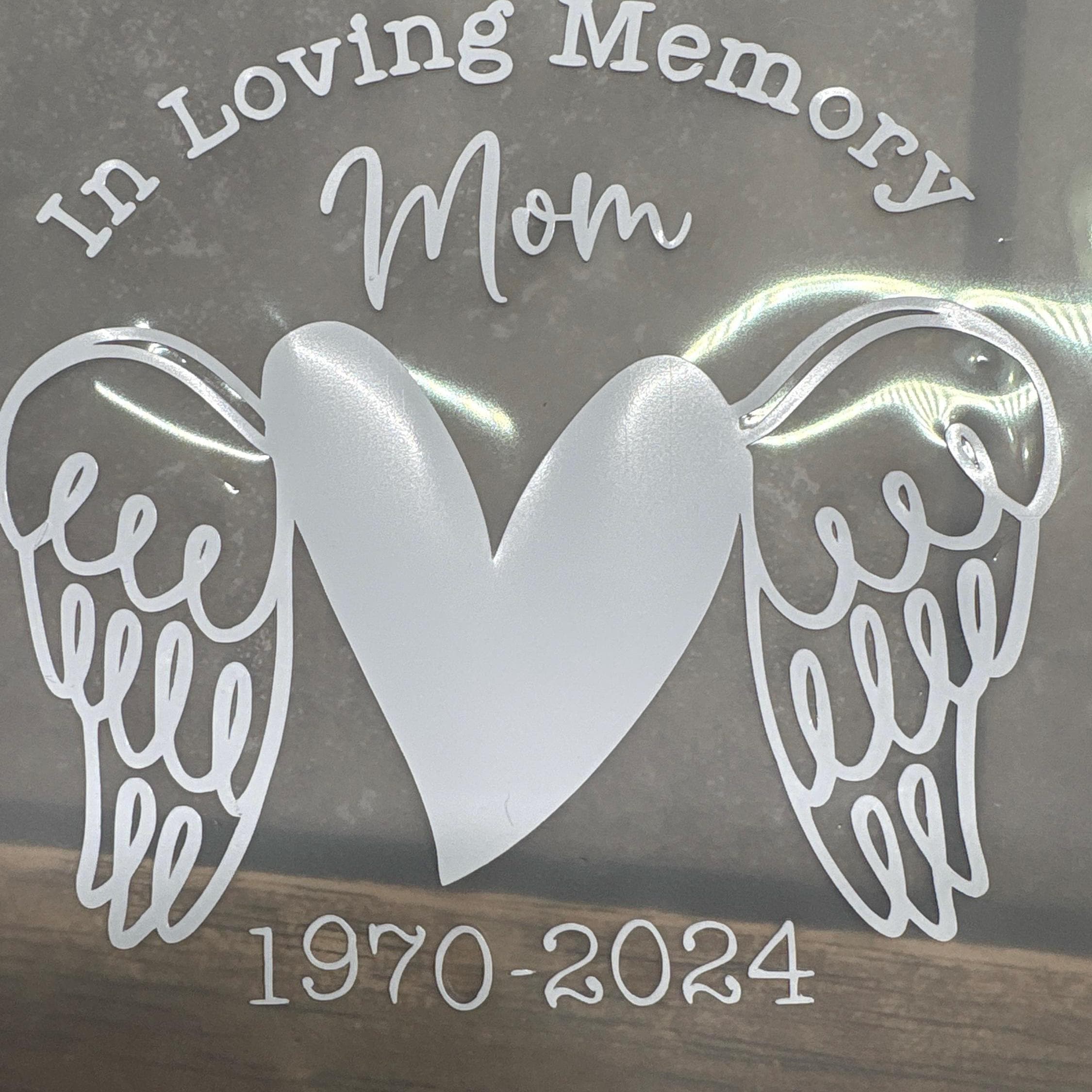 Honor your loved one with a heartfelt tribute. This custom memorial decal features a stylized heart with angel wings and the phrase “In Loving Memory,” making it a beautiful way to commemorate someone special. Personalize it with your choice of name and dates to create a meaningful keepsake for car windows, tumblers, memory boxes, or scrapbooks.