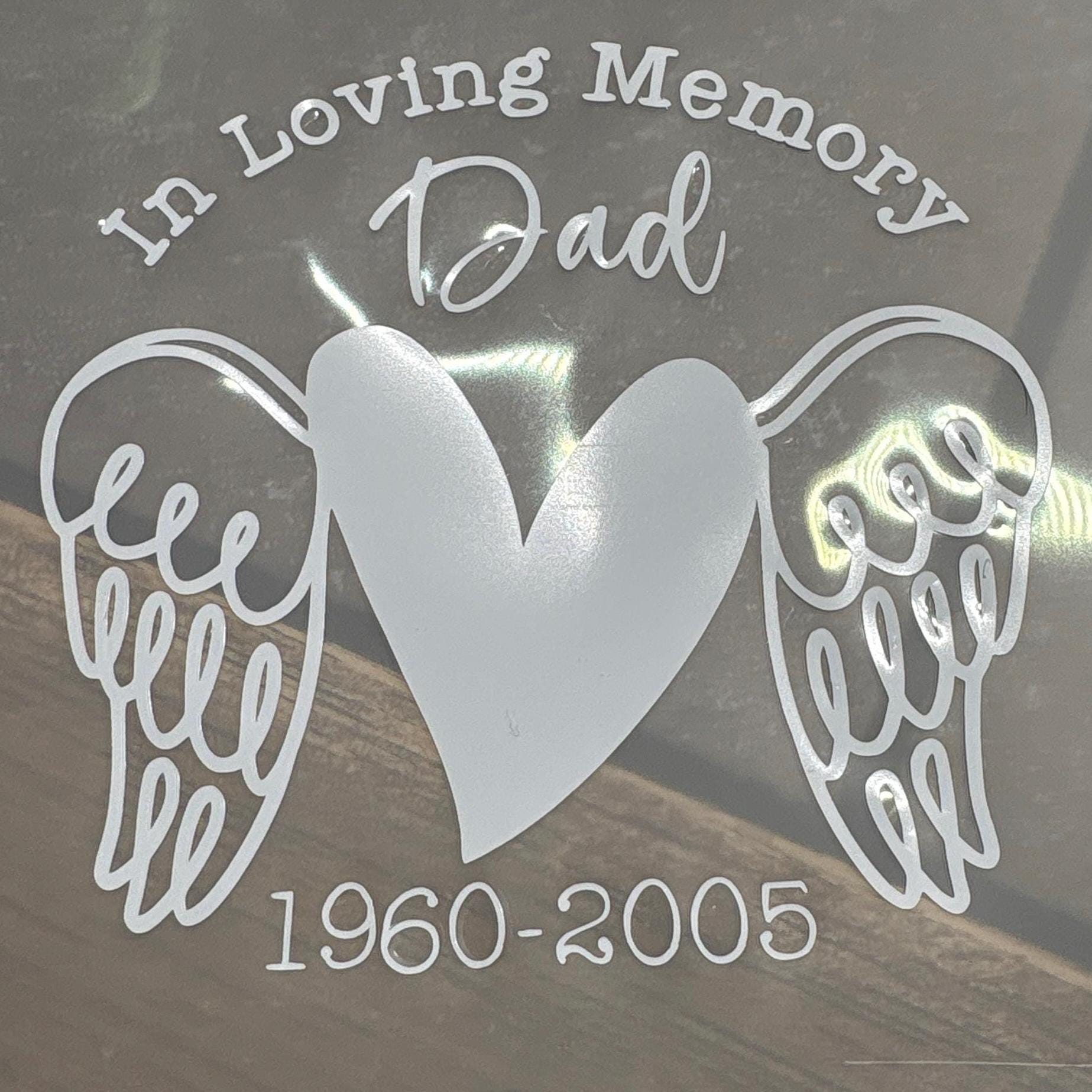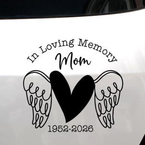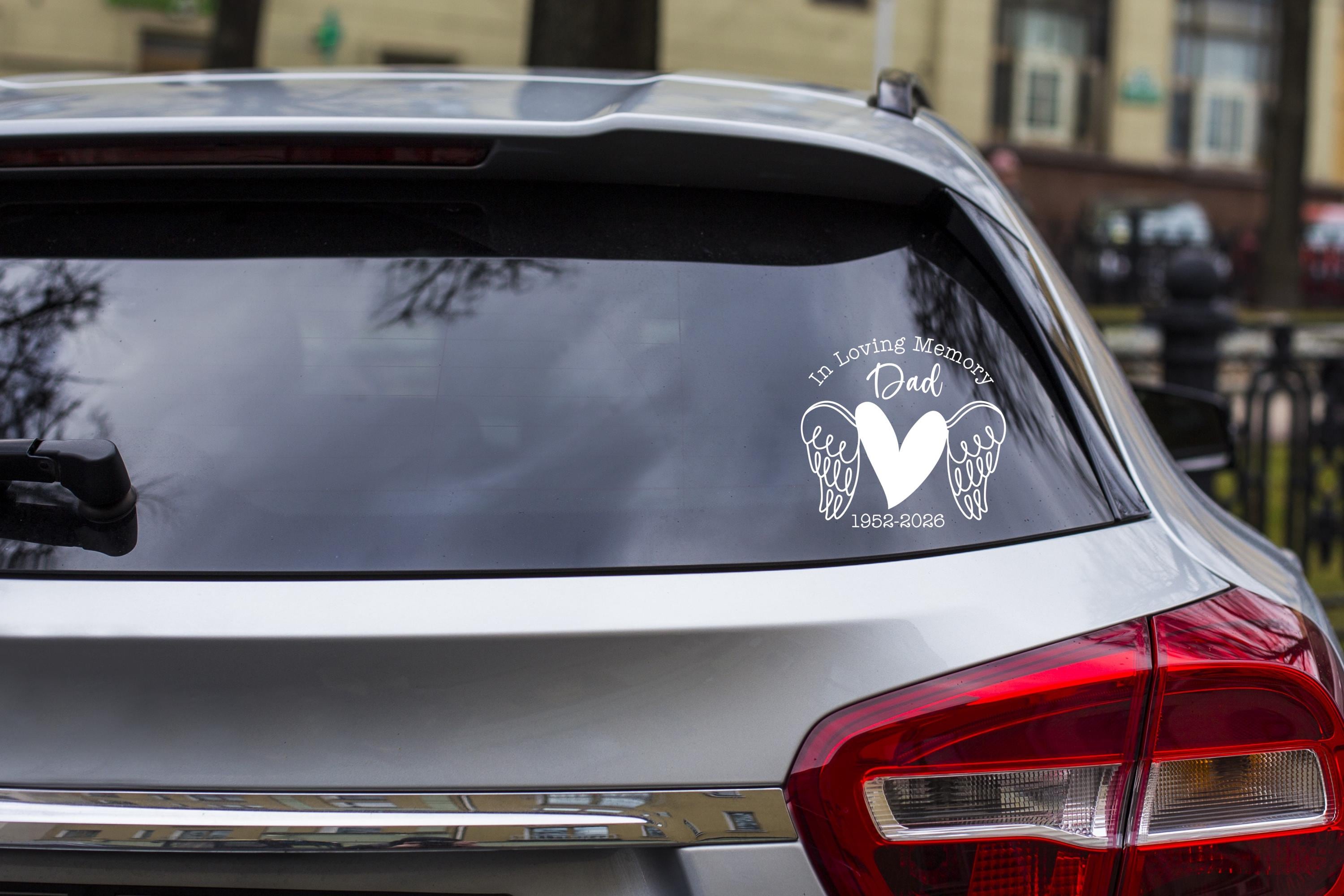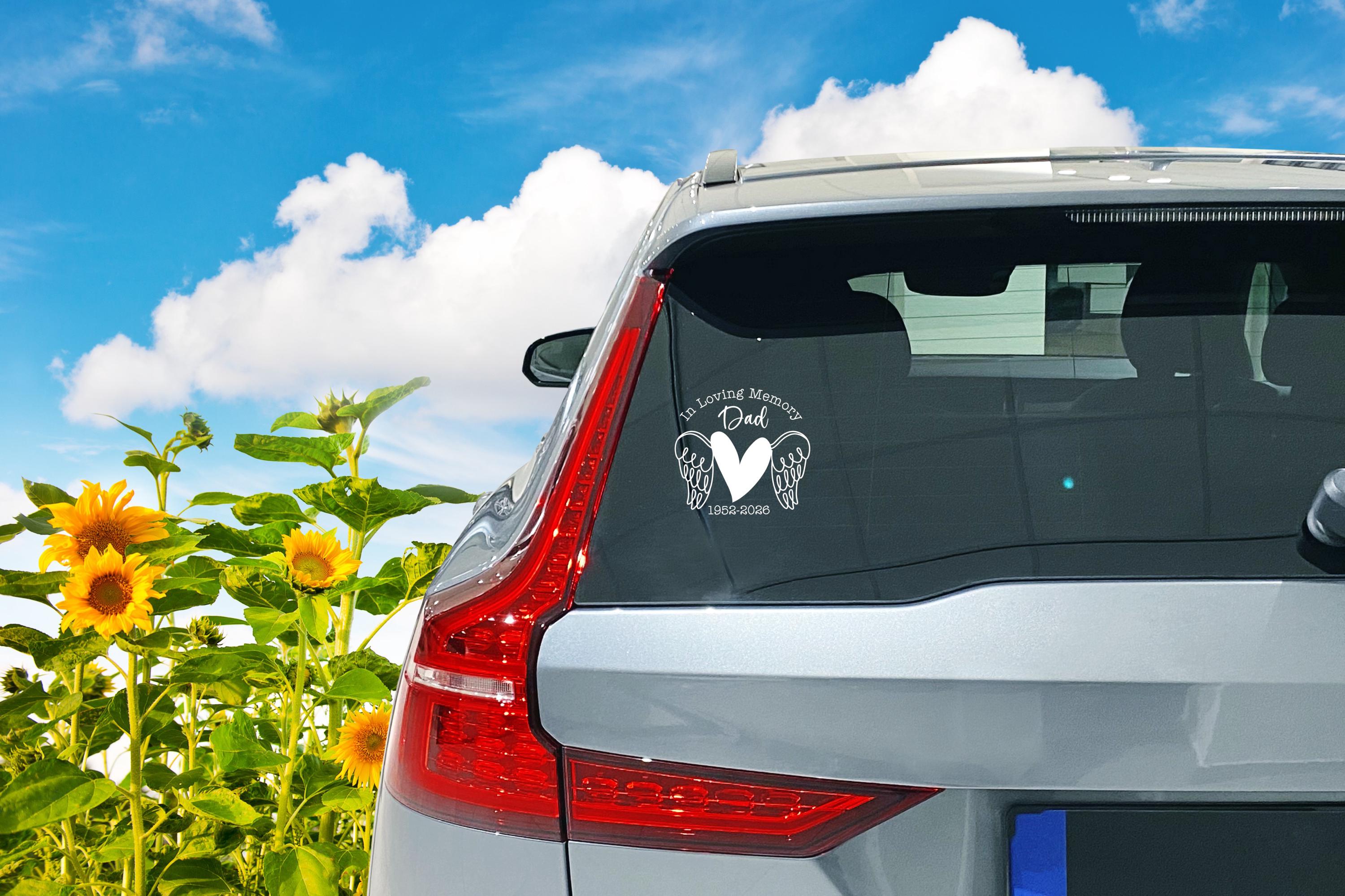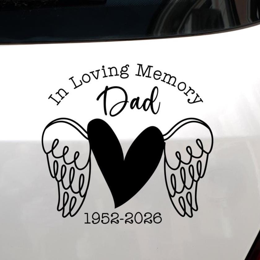 Honor your loved one with a heartfelt tribute. This custom memorial decal features a stylized heart with angel wings and the phrase “In Loving Memory,” making it a beautiful way to commemorate someone special. Personalize it with your choice of name and dates to create a meaningful keepsake for car windows, tumblers, memory boxes, or scrapbooks.